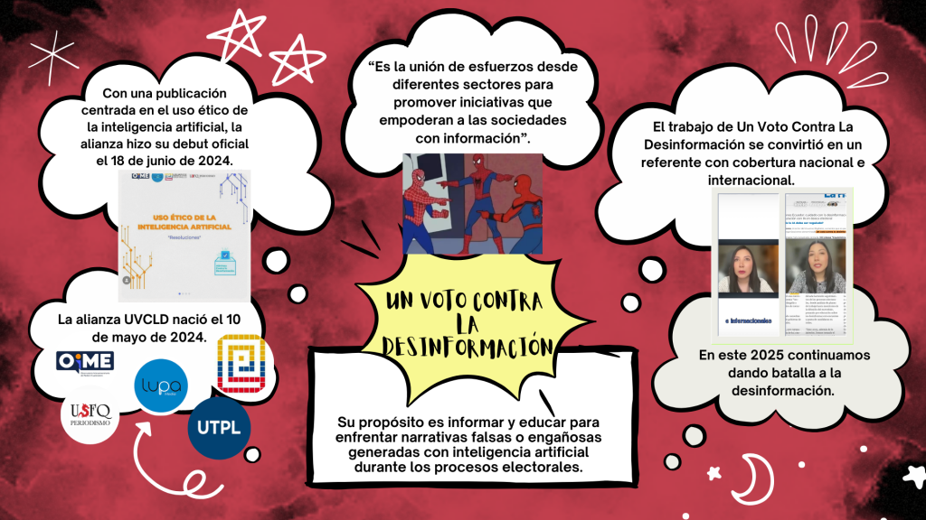 Este encuentro, que se realizó el miércoles 12 de noviembre de 2025, contó con la intervención de tres referentes nacionales y una vocera internacional, especialistas en verificación, alfabetización mediática, derechos digitales e investigación: Carolina Bazante (fundadora y directora ejecutiva de Lupa Media), Ana Laura García (equipo de Educación de Chequeado en Argentina), Alfredo Velazco (director de Usuarios Digitales) y Pamela J. Cruz (coordinadora del Observatorio Interuniversitario de Medios Ecuatorianos-OIME).