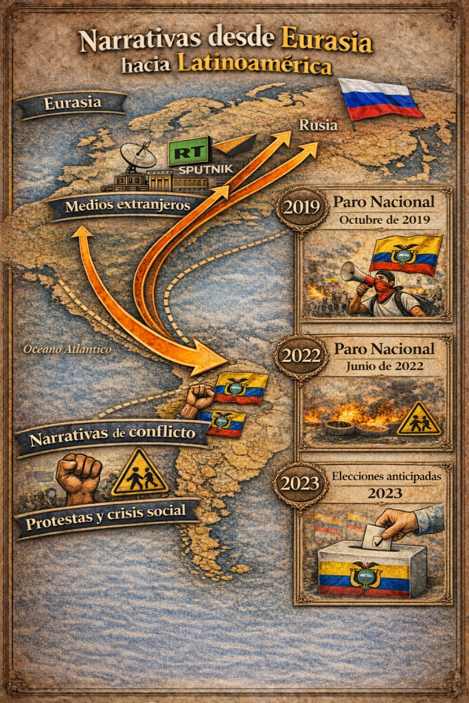 Ecuador ha atravesado en los últimos años por una serie de crisis políticas y sociales que han puesto a prueba no solo a sus instituciones, sino también la forma en que circula y se consume la información en el país. En contextos marcados por la protesta social, la inestabilidad gubernamental y los procesos electorales anticipados, la información adquiere un rol central en la forma en que la ciudadanía comprende la realidad. No obstante, junto con el aumento del flujo informativo, también se intensifica la circulación de narrativas configuradas dentro y fuera del país que buscan orientar la interpretación de los acontecimientos y moldear la opinión pública, especialmente a través de los medios y las redes sociodigitales.