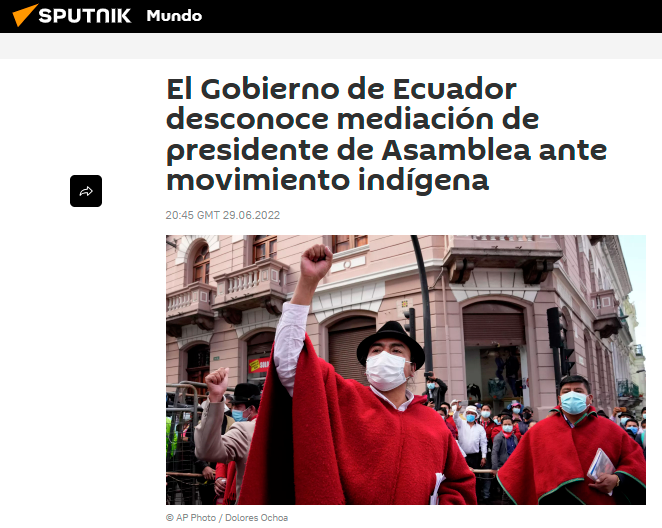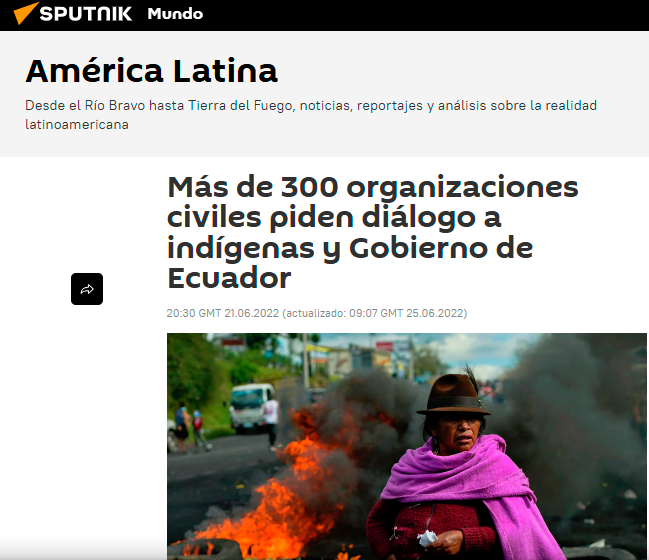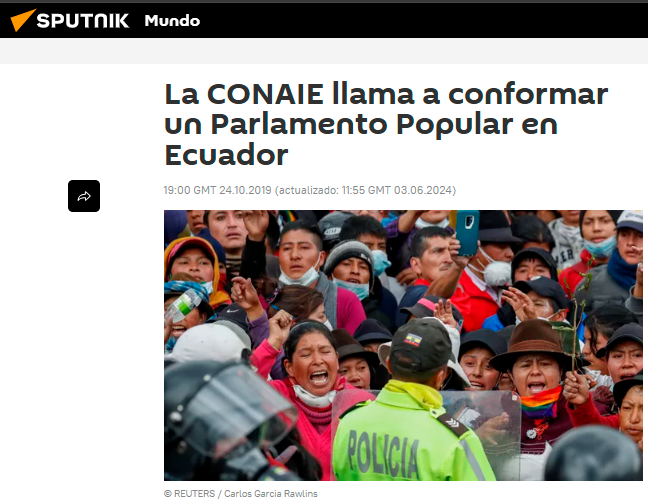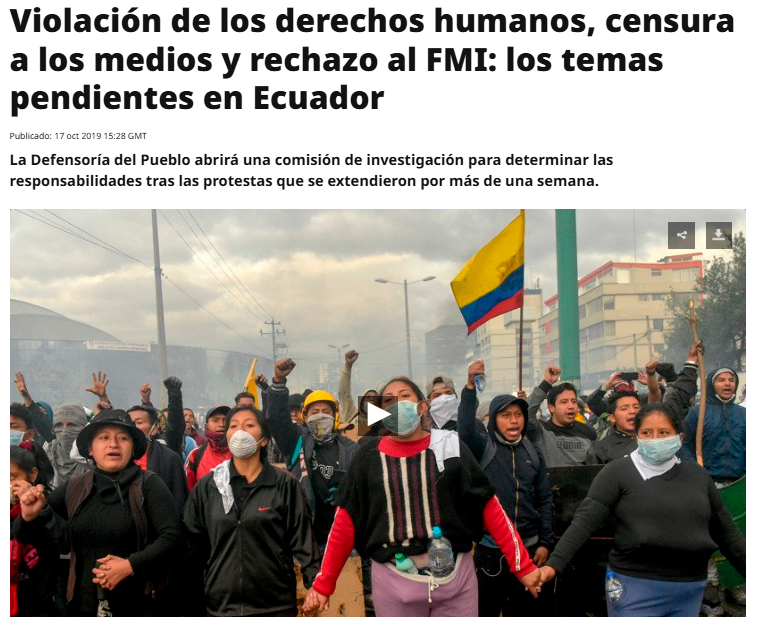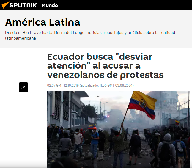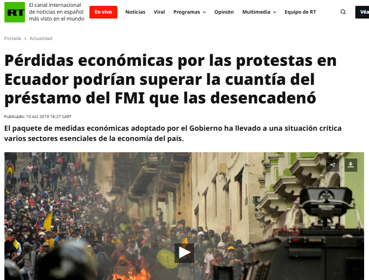 En los contextos de crisis sociopolíticas analizados, la investigación se centra en la cobertura realizada por los medios internacionales estatales rusos Russia Today (RT) y Sputnik, cuyos contenidos digitales abordaron los acontecimientos ocurridos en Ecuador entre 2019 y 2023. En el caso del paro de octubre de 2019, estos medios recurrieron de forma reiterada al encuadre del «paquetazo» para referirse al conjunto de medidas económicas impulsadas por el gobierno de Lenín Moreno, presentándolo como un factor central del conflicto social. A partir de este y otros hechos reales, RT y Sputnik construyeron narrativas que enfatizaron la confrontación política, el descontento ciudadano y la desconfianza hacia las instituciones estatales.